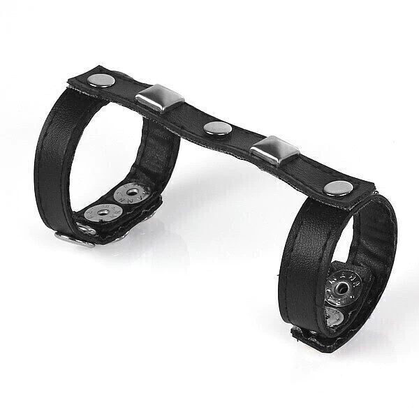 Para uma fantasia mais fetichista, este anel feito em couro sintético deixa o pênis mais sexy e seus adereços em metal regulam a largura.
